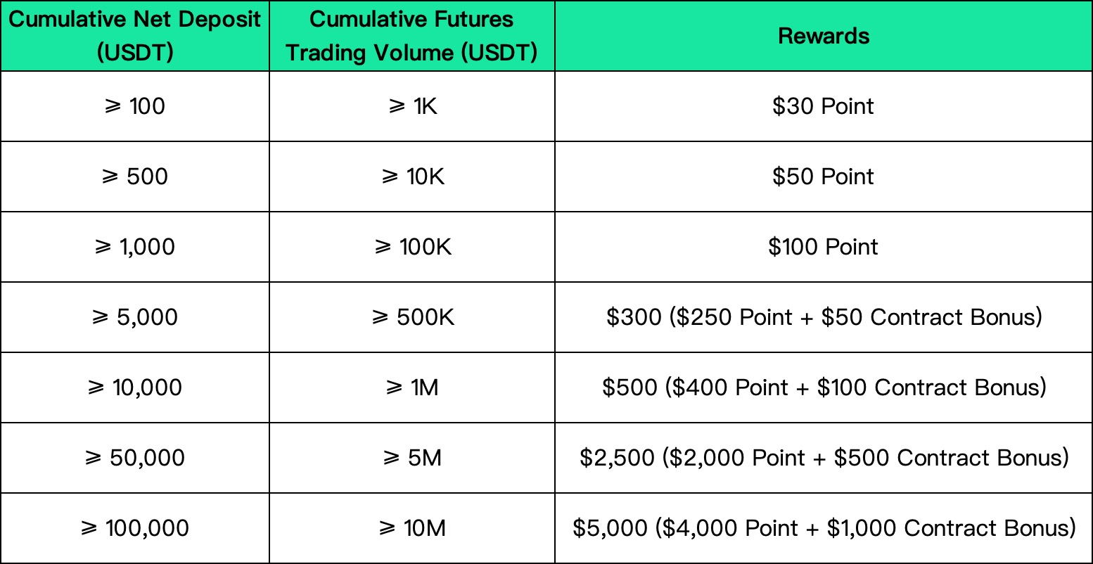 During the event, newly registered users can win up to $5,000 point after finishing the first deposit and make futures trading (USDT-Margined).